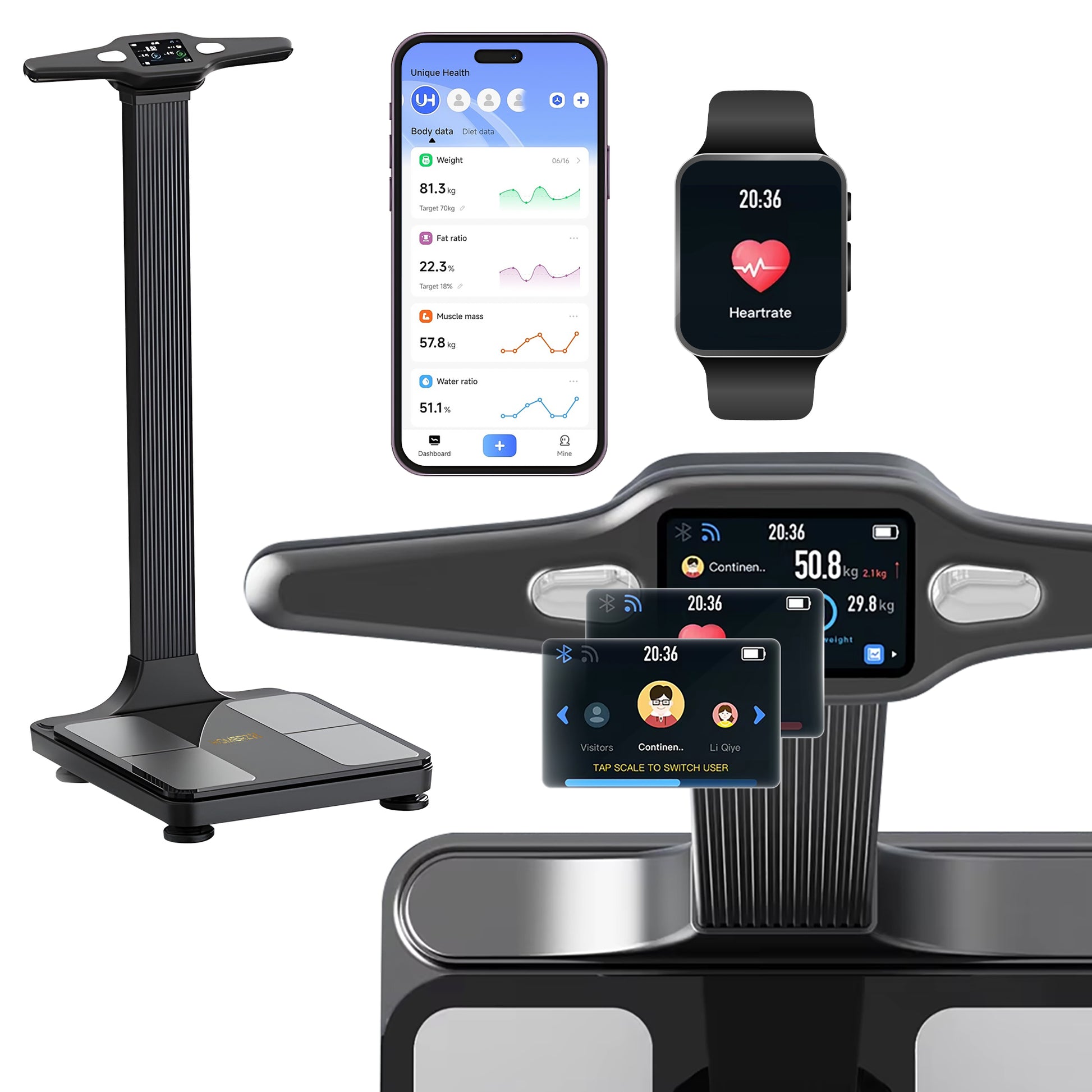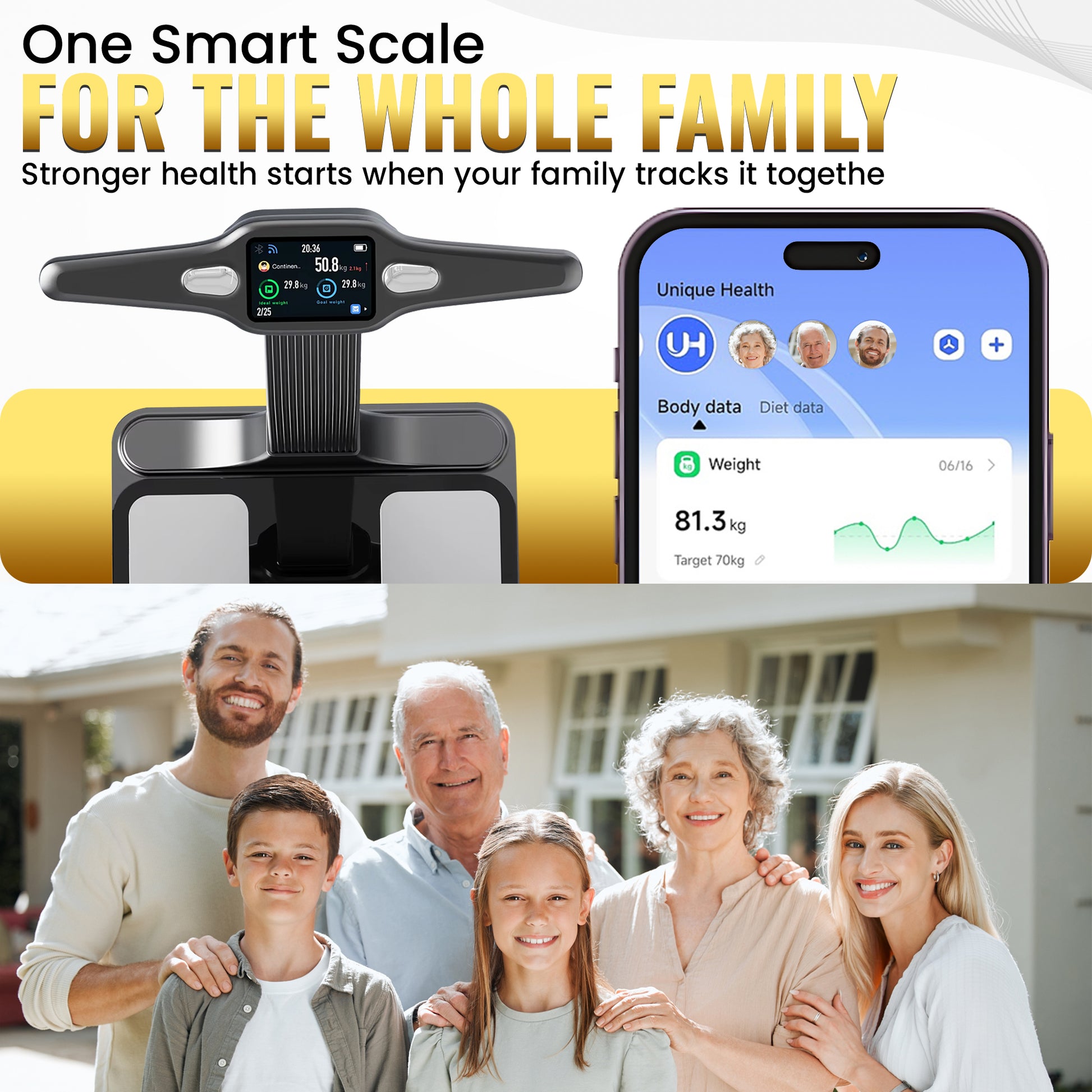 - SEAMLESS APP SYNC: Connect your smart scale with app support via WiFi or Bluetooth to sync data in real-time. Compatible with your favorite health Apps such as Apple Health, the Unique Health app stores 90 days of body composition data for up to 50 users, making this the ideal body fat scale with app for families, personal trainers, and fitness journeys.