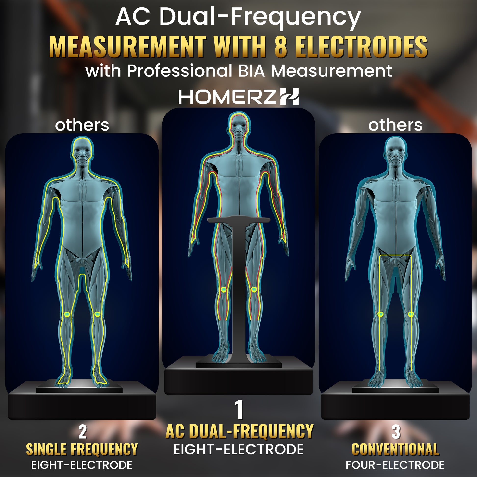 - FULL BODY INSIGHT: Unlike basic scales that use only 4 electrodes, Homerz BMI scale uses 8 electrodes and dual-frequency BIA to scan your body from limbs to torso. Our body scan scale delivers real-time results on weight, body fat, muscle mass, hydration, protein, bone mass, and 50 more body composition metrics.